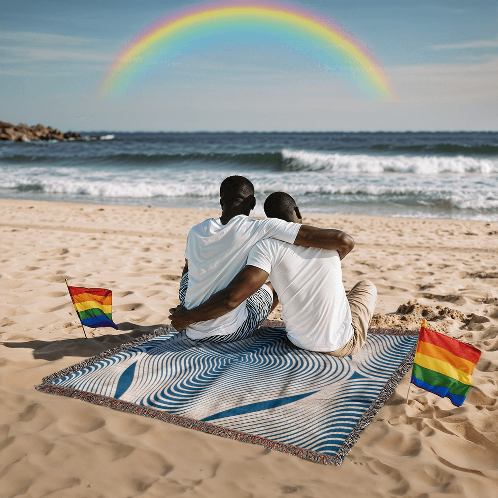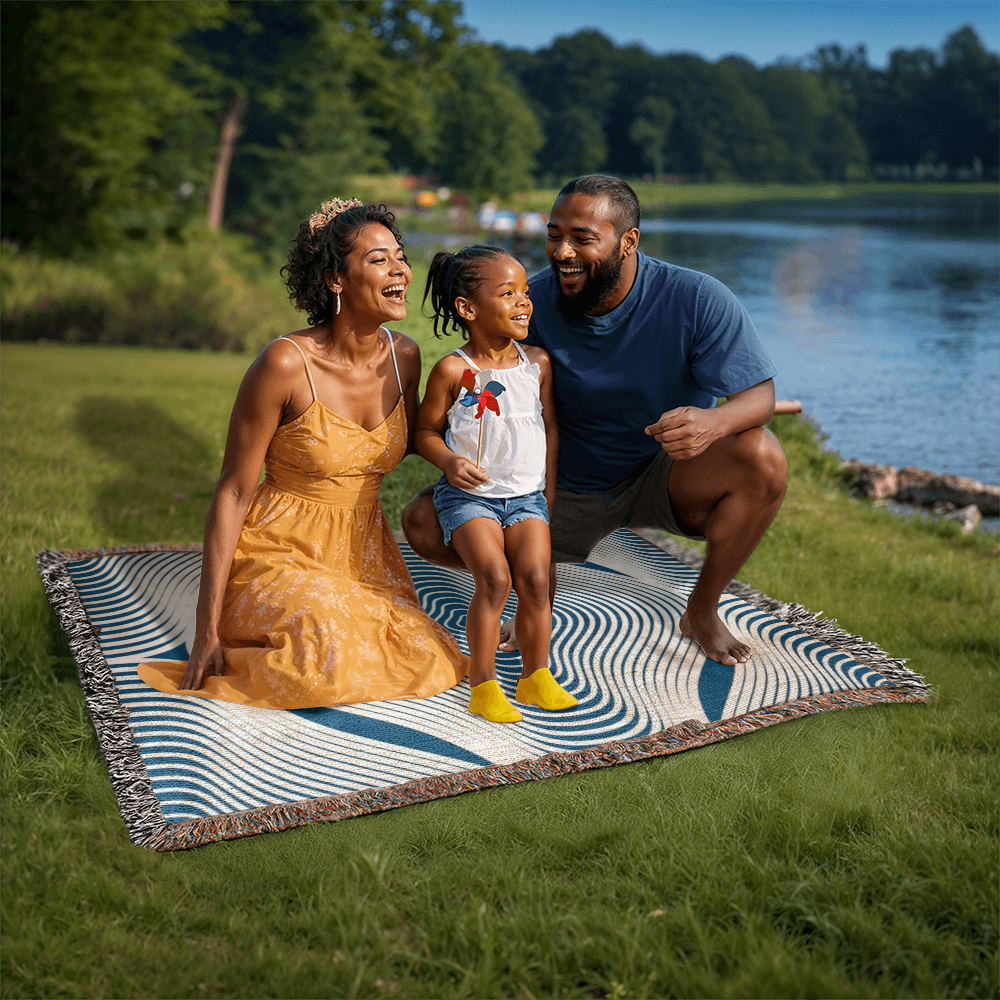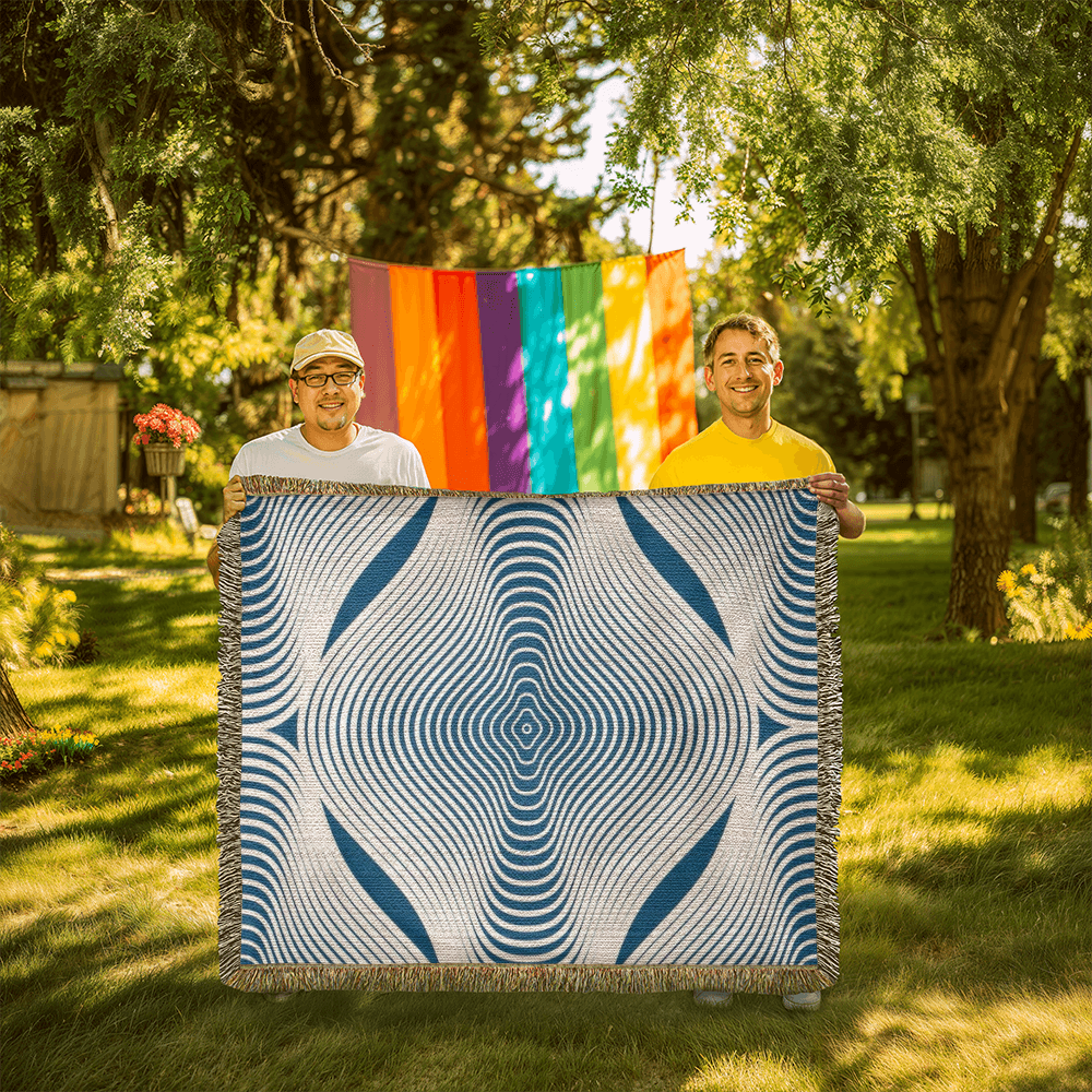 Custom Designer Blue Hypnotic Heirloom Artwork Woven Blanket. This custom product is lovingly woven on a loom with cozy 100% cotton yarn. It makes an ideal gift for your beloved partner, family members, or dear friends on special occasions like birthdays, anniversaries, or any event where you want to express your love and appreciation in an unforgettable way.