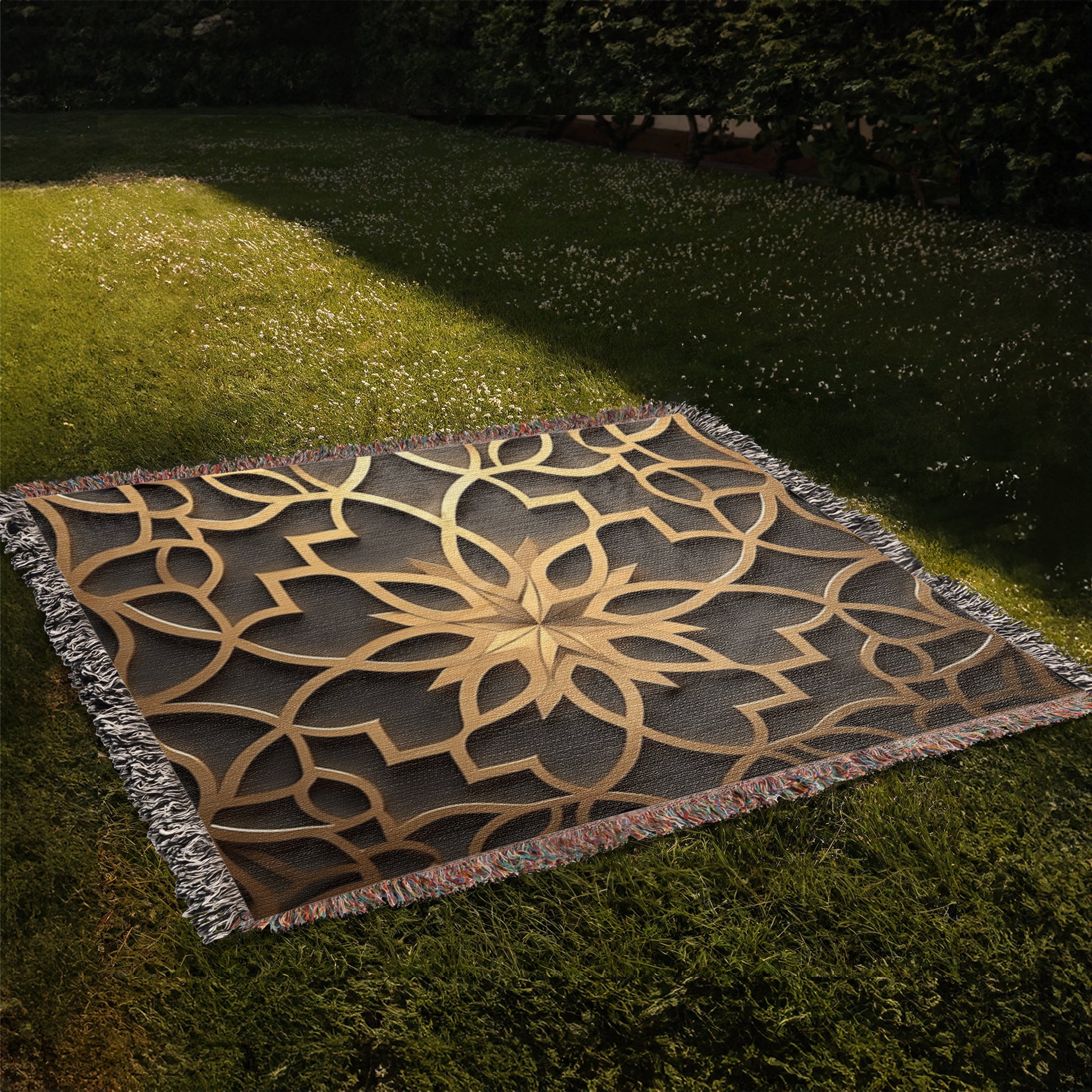 Elevate your home with this custom designer woven blanket featuring star flower inlay heirloom artwork. Its intricate design adds a graceful and artistic touch, while the soft woven fabric provides cozy warmth. Perfect for adding elegance and comfort to any room, this blanket is a beautiful blend of style and function.