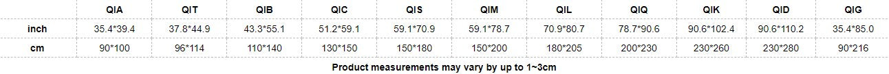 | cm | 90*100 | 96*114 | 110*140 | 130*150 | 150*180 | 150*200 | 180*205 | 200*230 | 230*260 | 230*280 | 90*216 |