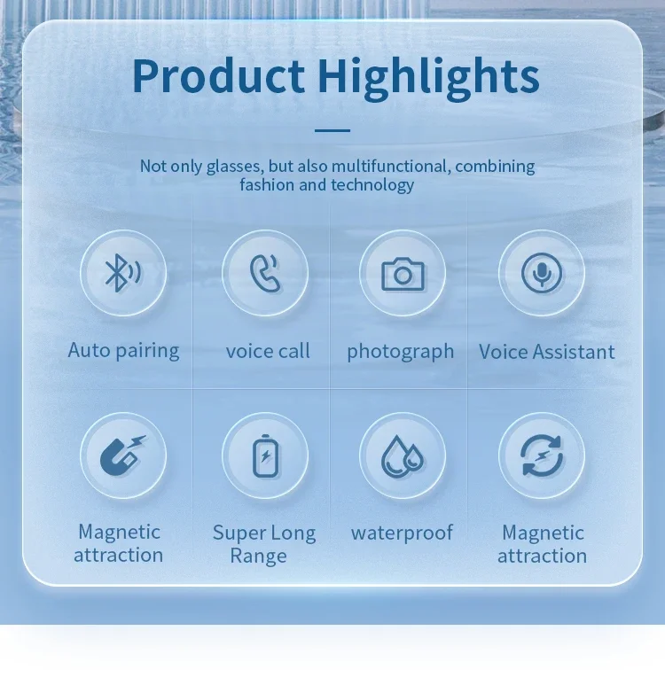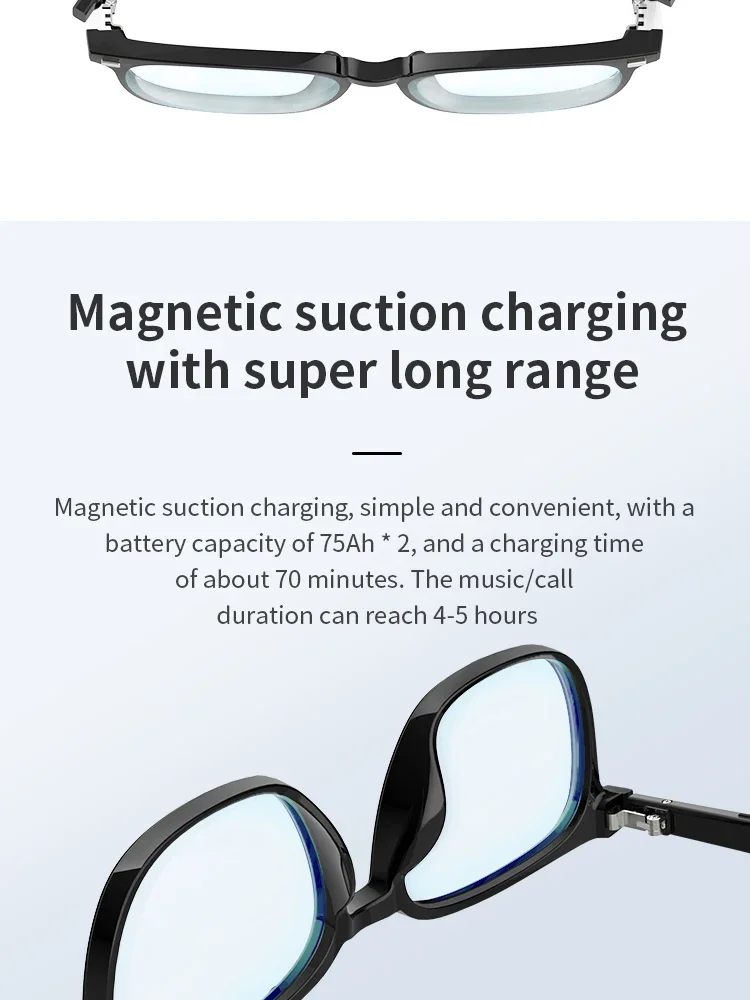 The New G05 Smart Bluetooth Glasses offer a sophisticated blend of technology and convenience. Featuring magnetic suction for easy lens disassembly, these glasses provide seamless control over phone calls, music, and photos. With integrated voice assistant support and remote control functionality, they enhance your daily interactions while maintaining a sleek, modern design. Perfect for those seeking innovation and style in one smart accessory.